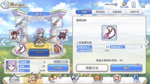 结伴而行的公主也需要通过升级的方式才能变得更加强大,除了人物等级之外,还需要通过收集装备的方式让公主提升 Rank,提升 Rank 的作用不仅在于提升基本数值,还可解锁新的技能进行战斗,技能也有等级之分,解锁后可进行强化。